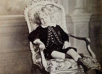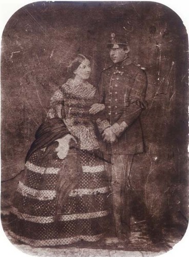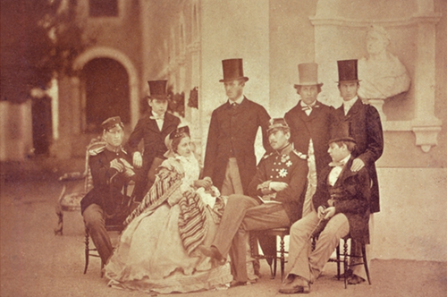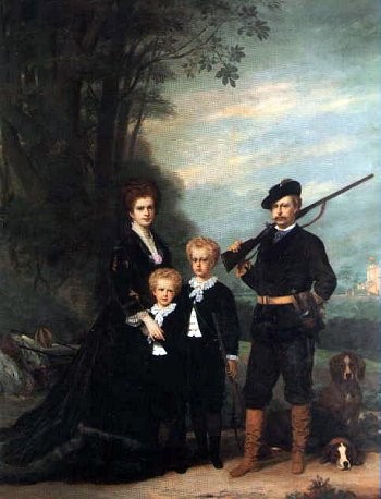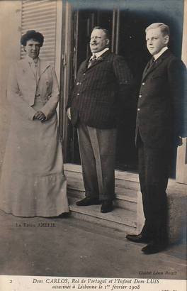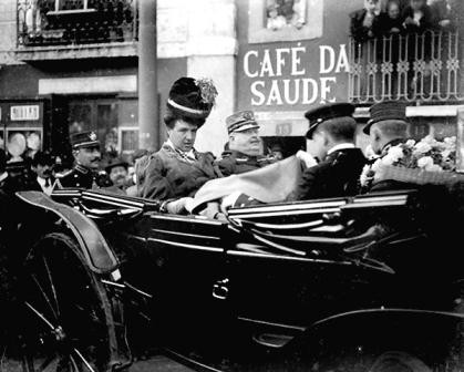 Família Real A Rainha D.Maria Pia, o Infante D.Afonso, o Príncipe D.Carlos, e o Rei D.Luís. Ao fundo à direita, o Paço de Queluz com o estandarte dos Bragança. Ano de 1876.