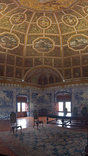Sala dos Brasões no Palácio Nacional de Sintra, cuja cúpula ostenta as armas de D. Manuel I, de seus filhos e de setenta e duas das mais importantes famílias da Nobreza. O revestimento das paredes data do século XVIII, obra de grandes mestres da azulejaria lisboeta da altura.