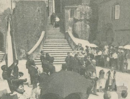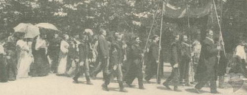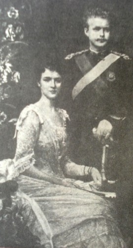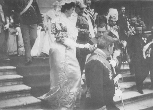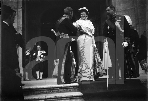 D. Carlos e D. Amélia na saída das exéquias realizadas por alma do rei D. Luís I em 19.10.1903. Imagem do catafalco armado no interior do templo (parece estar em cima do ataúde um capecete militar e não a coroa real). O corpo de archeiros da casa real faz escolta de honra e avança com as alabardas derreadas e as cabeças descobertas em sinal de luto. A rainha veste de luto pesado.