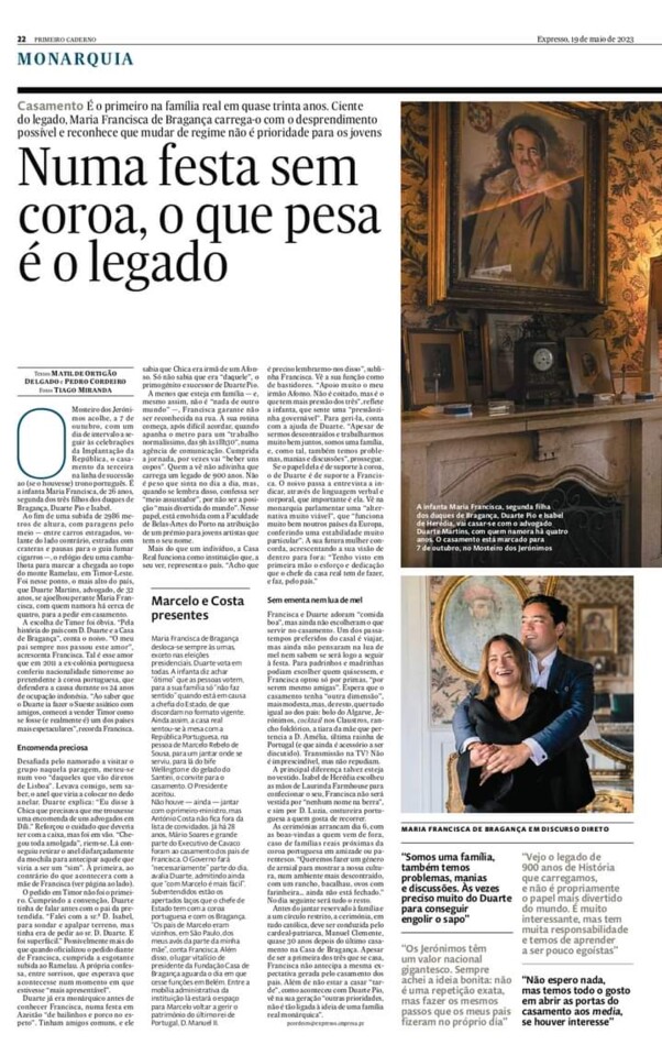 A Infanta de Maria Francisca e o seu noivo, Duarte de Sousa Araújo Martins, concederam uma entrevista à revista francesa "Point de Vue". Pode ler a entrevista aqui.