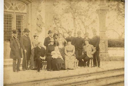Fotografia de grupo da Família Real em 1887; impressão fotográfica; prova em papel albuminado; autor. D. Carlos I. Em primeiro plano, da esquerda para a direita, sentados: D. Luis, a rainha D. Amélia, com o príncipe D. Luis Filipe ao colo, D. Maria Pia e o rei D. Carlos - Palácio Nacional da Pena