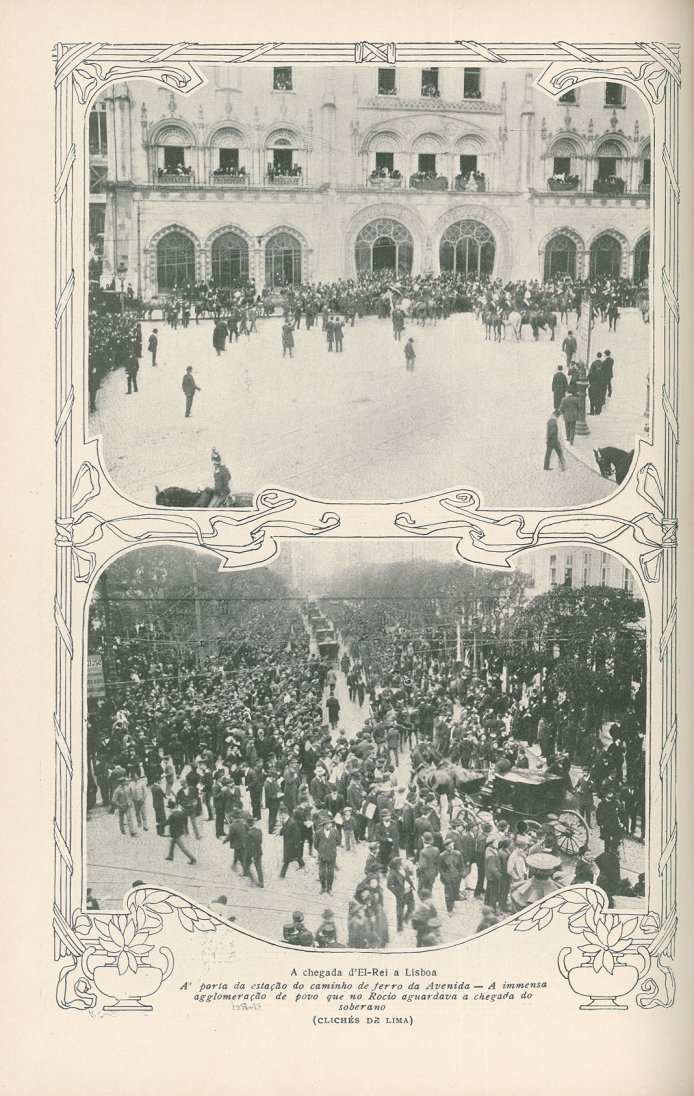 Ver Aqui: http://hemerotecadigital.cm-lisboa.pt/OBRAS/IlustracaoPort/1908/N145/N145_master/JPG/N145_0017_branca_t0.jpg Vanguarda do préstito académico em transito pela rua Larga durante a recepção oficial ao rei D. Manuel II, (...)